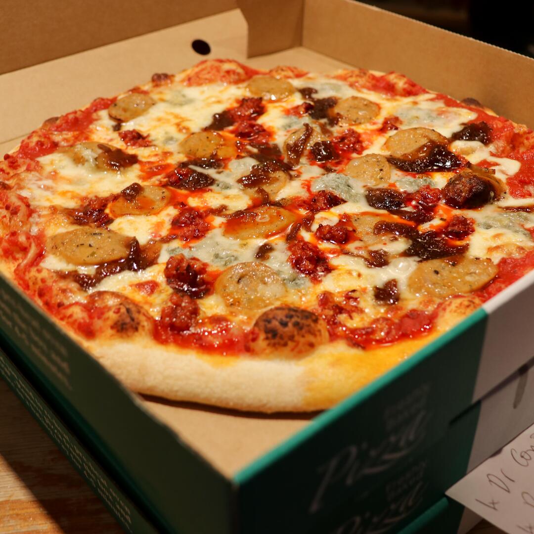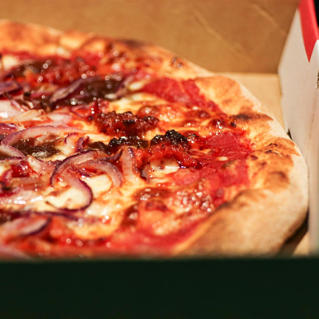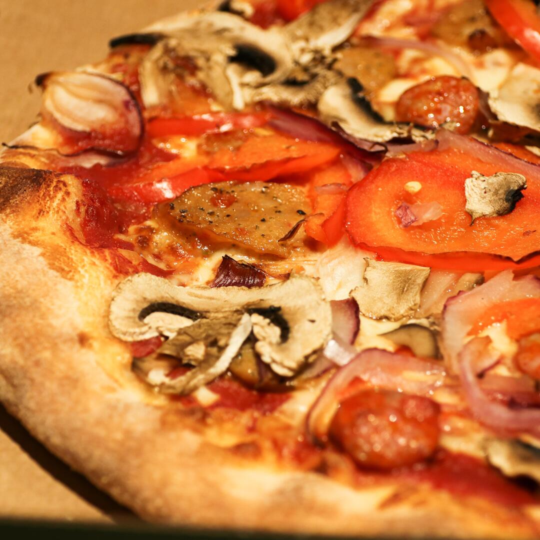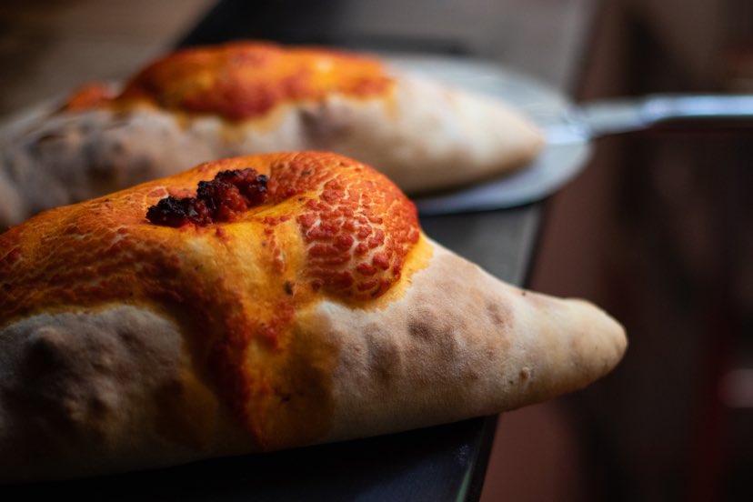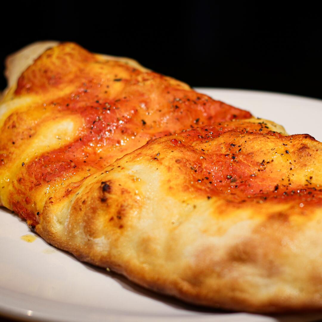 Half-moon folded pizza filled with mozzarella cheese, Nduja Calabrian spicy sausage, spicy salame and Italian sausage topped with a dash of tomato sauce.