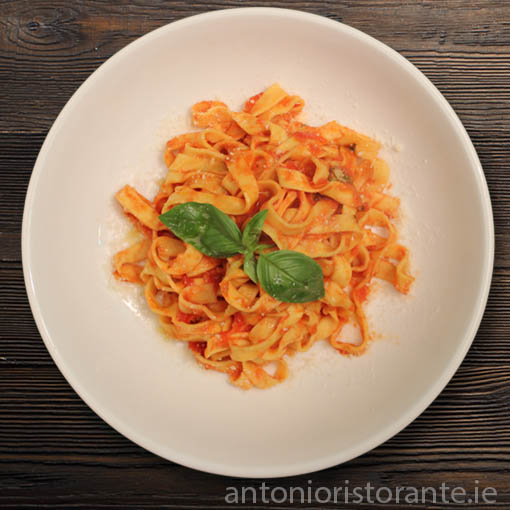 Fresh Tagliatelle pasta specially prepared with an authentic Italian tomato sauce seasoned with parmesan cheese.