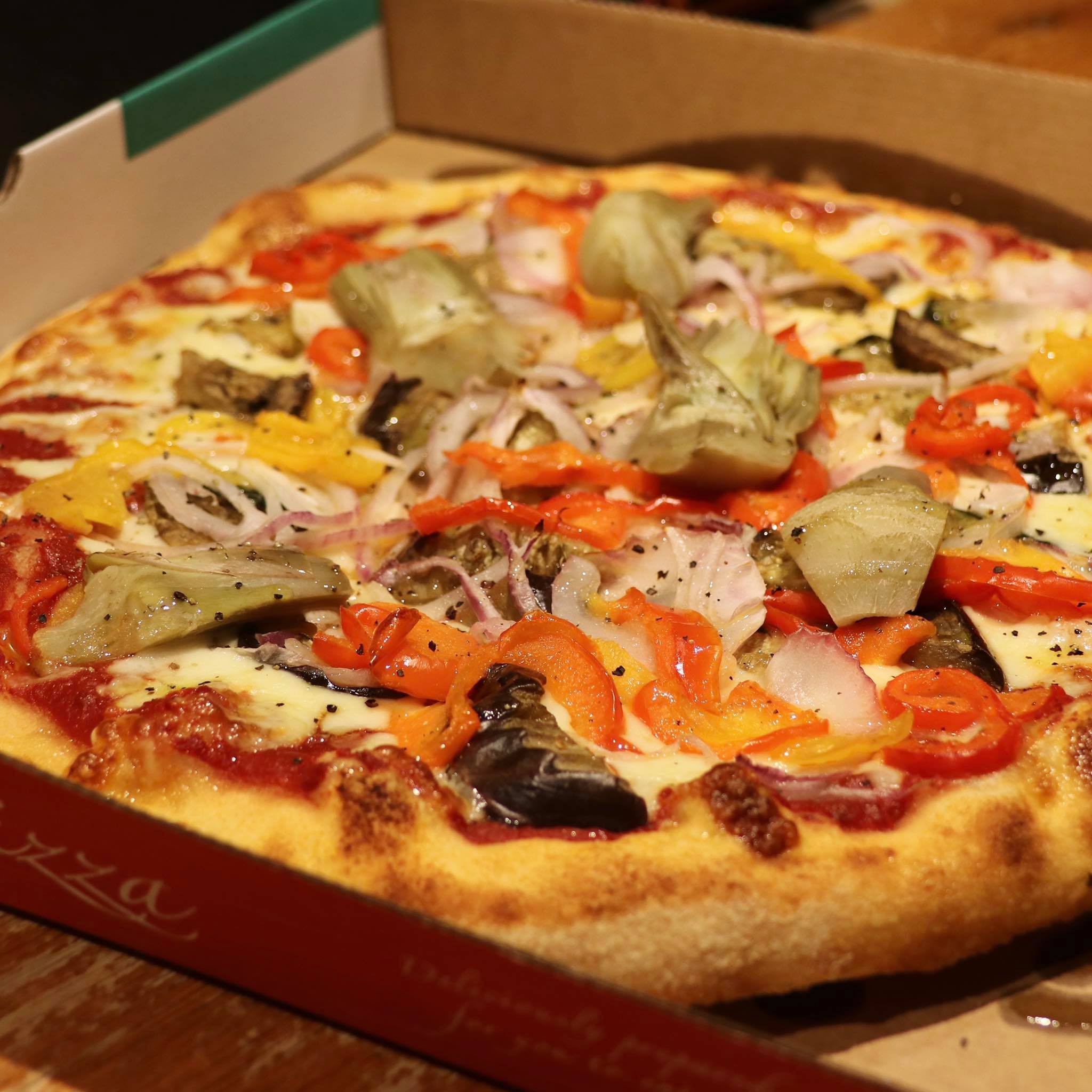Tomato sauce, mozzarella cheese, aubergines, courgettes, peppers and onions.